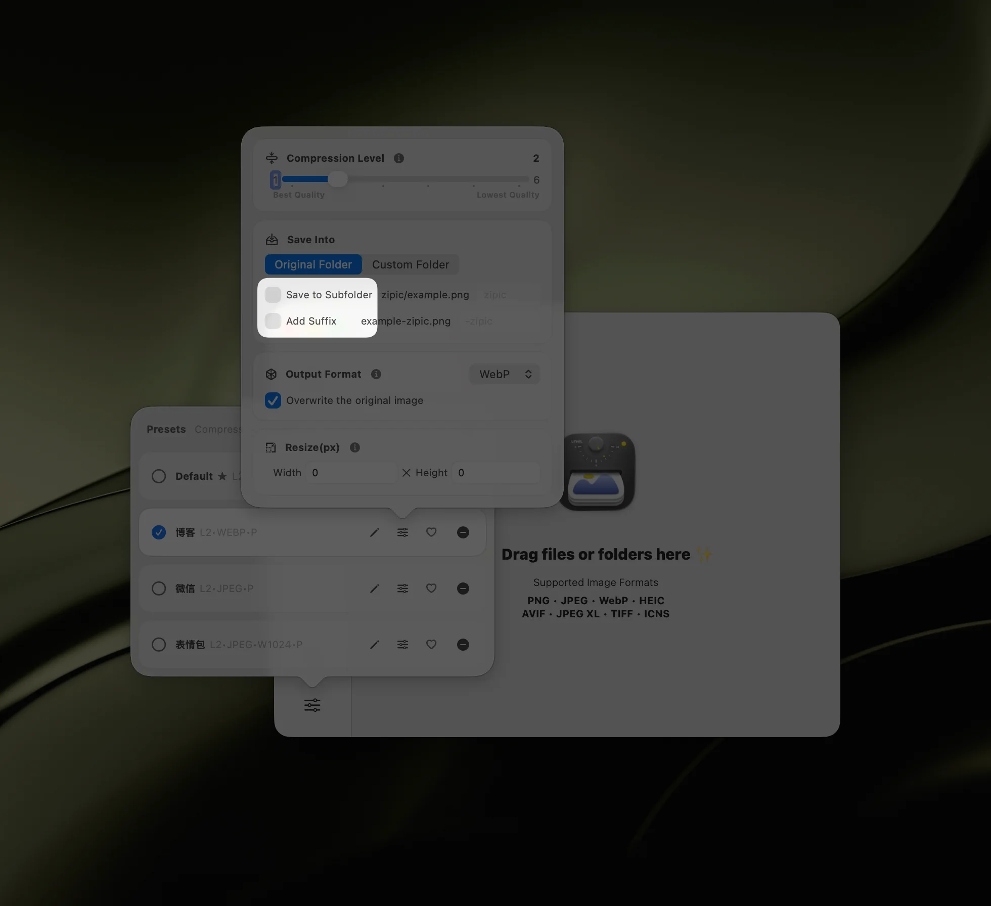 Zipic offers various save options for images, divided into Original Folder and Custom Folder.