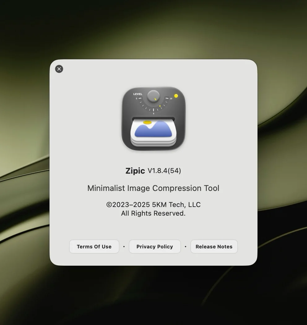 The about window contains the product name, version number, copyright information, and development team information. Clicking More Information will open the Zipic official website in the browser.