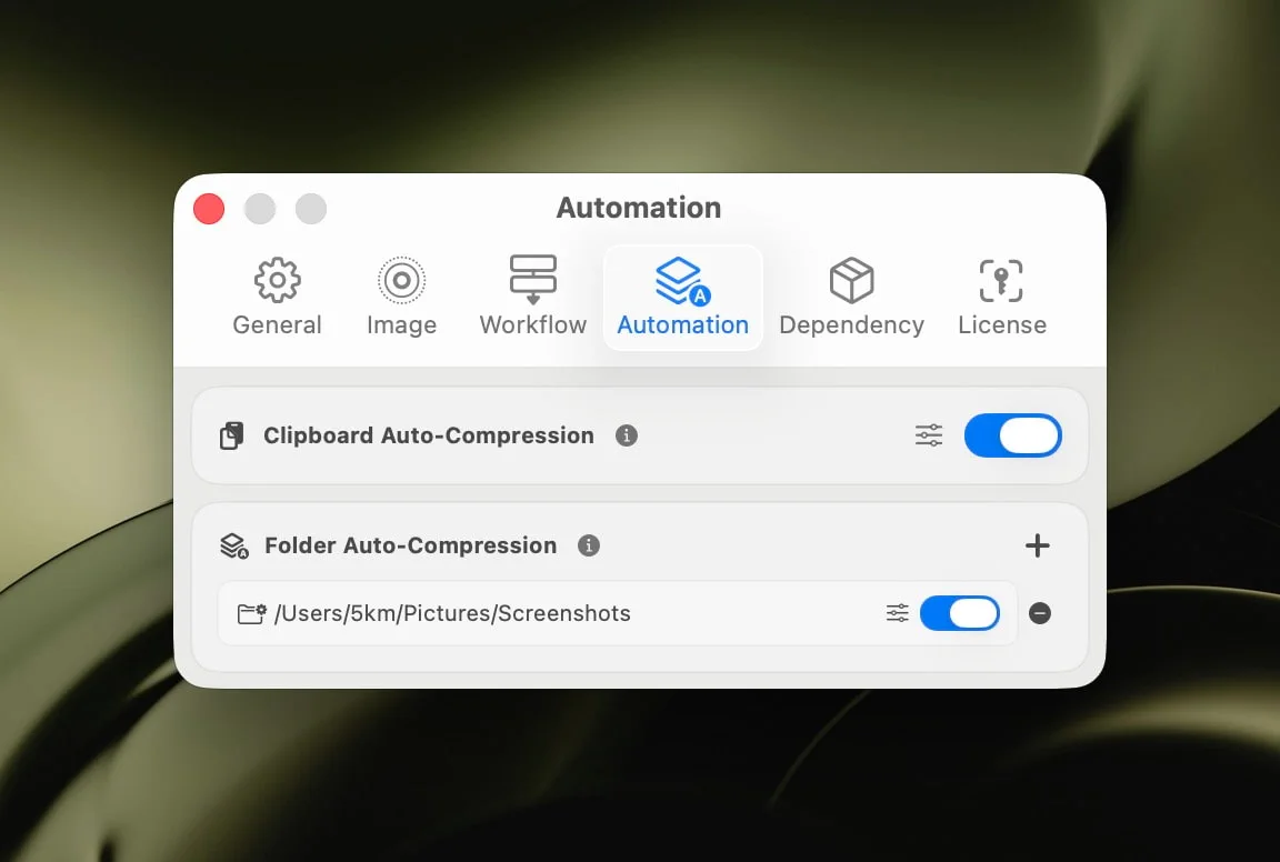 The Automation tab is used to configure automatic compression features. You can enable clipboard auto-compression, add folders for automatic monitoring and compression, and set independent compression options and monitoring depth for each monitored folder.
