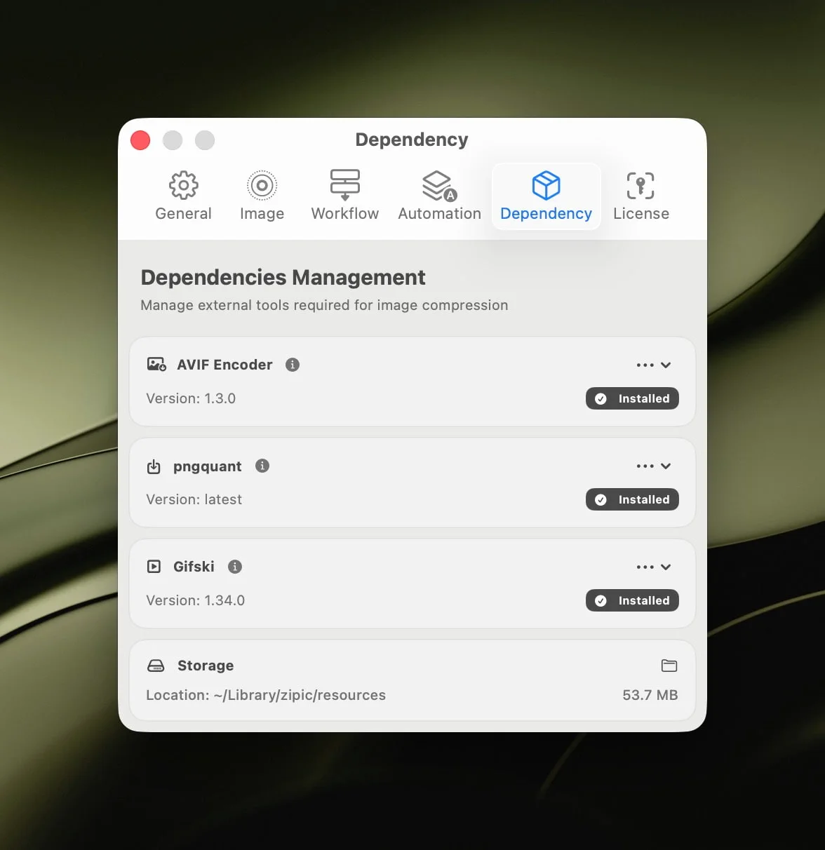 The Dependency tab is used to manage external tools required for image compression. You can view and manage the installation status and version information of dependencies such as AVIF encoder, pngquant, and Gifski, as well as view resource storage location and usage.