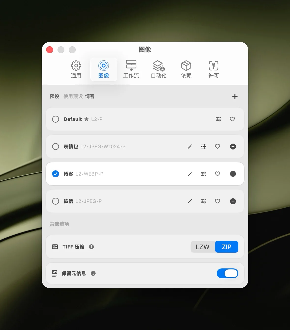 The Image tab is used to manage compression presets and image-related options. You can create, edit, and manage multiple compression presets, each with different compression levels, save formats, resize options, and more. You can also configure TIFF compression methods and whether to preserve metadata.