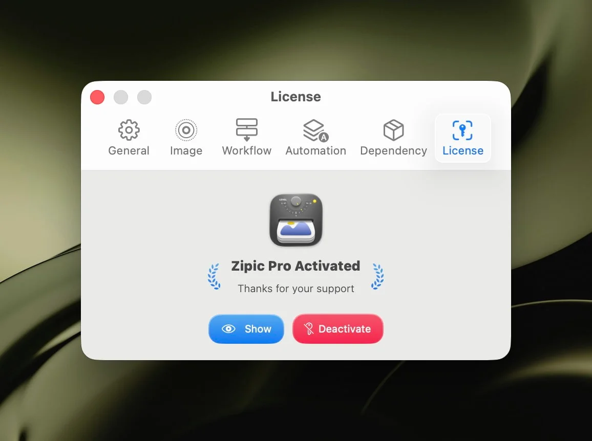 The License tab is used to manage Zipic Pro licenses. You can view license information, activate a license, and deactivate a license. Click Get Key to go to the Zipic official purchase page.