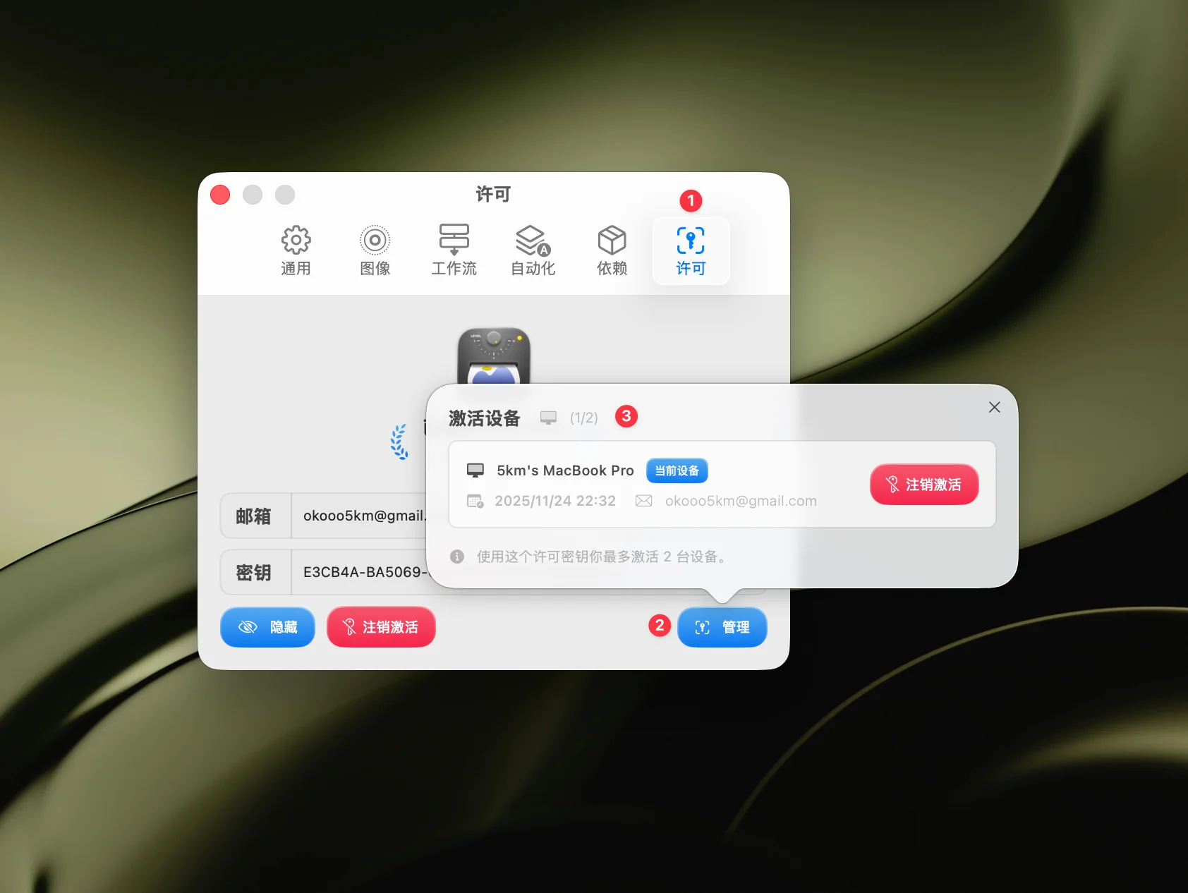 在 设置 → 许可 选项卡中,点击 管理 按钮可以查看已激活设备列表。设备列表中会显示每台设备的名称、激活时间、邮箱等信息,并标注当前设备。如果设备数量已满,可以在设备列表中点击 注销 按钮移除不再使用的设备,释放激活名额。
