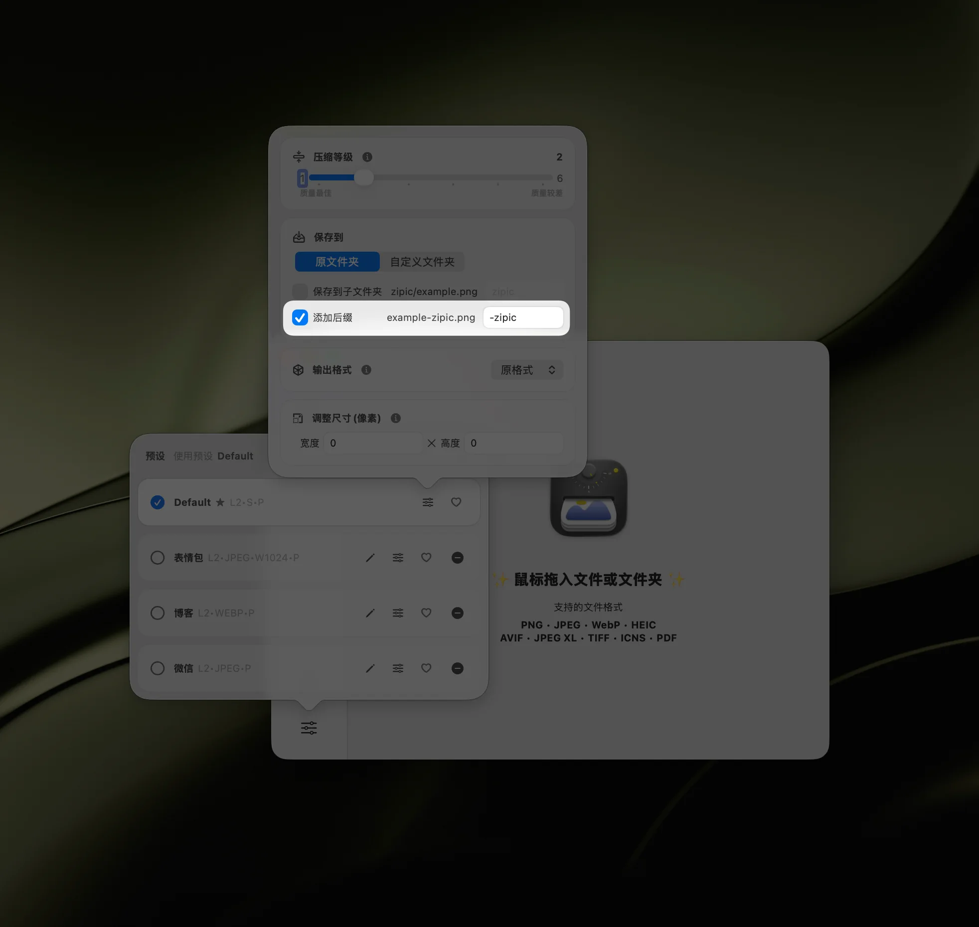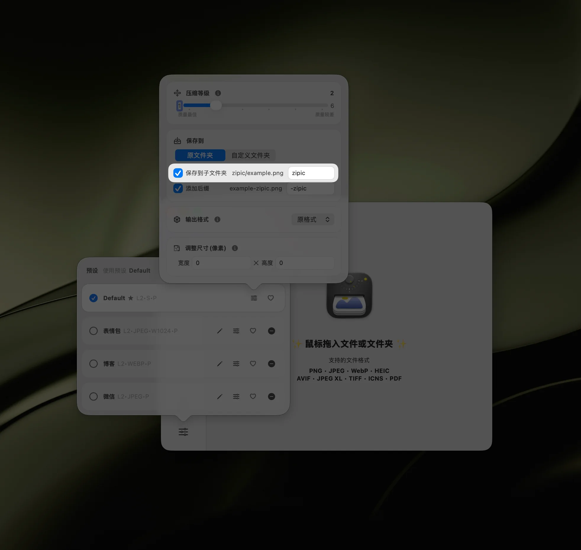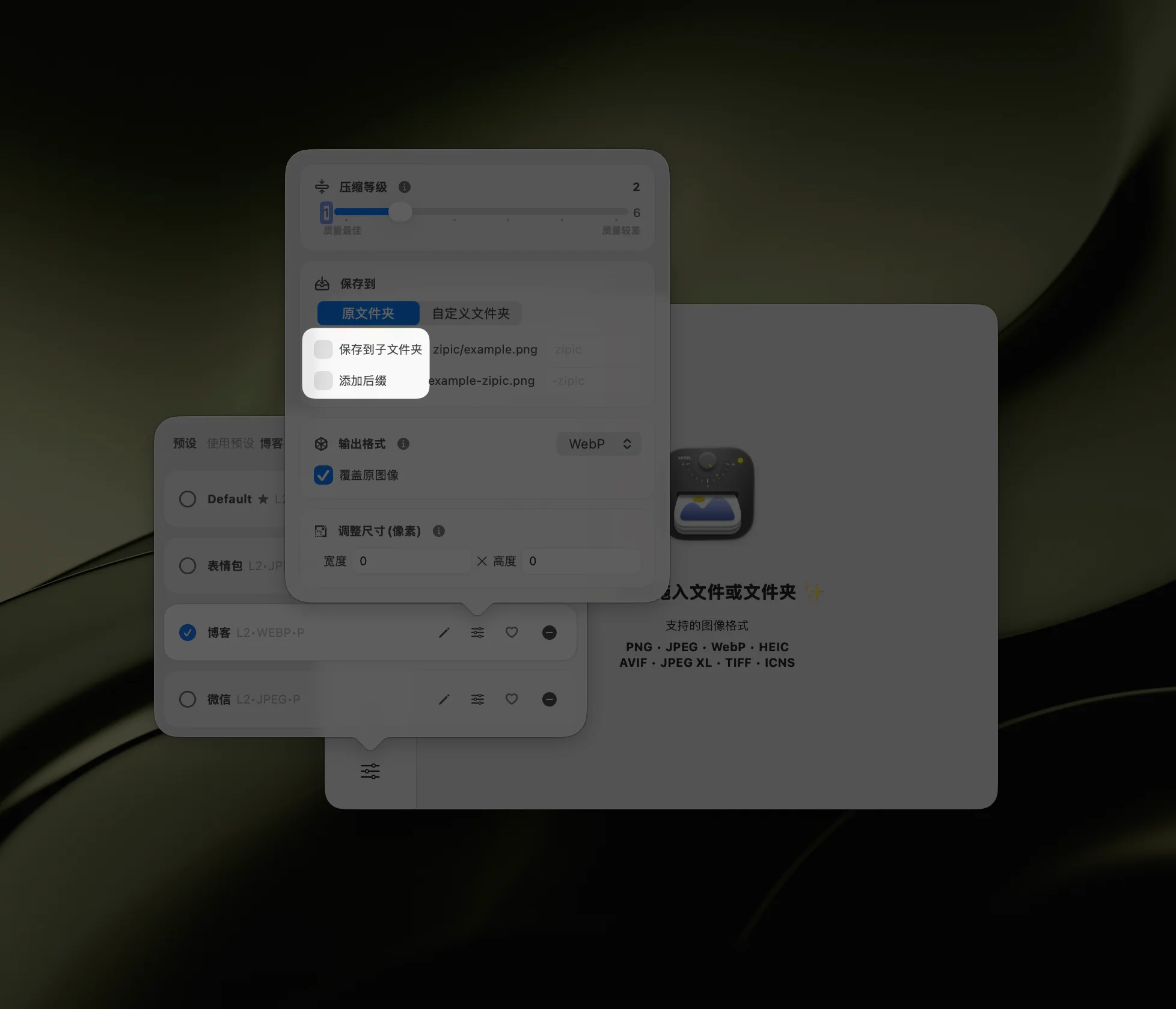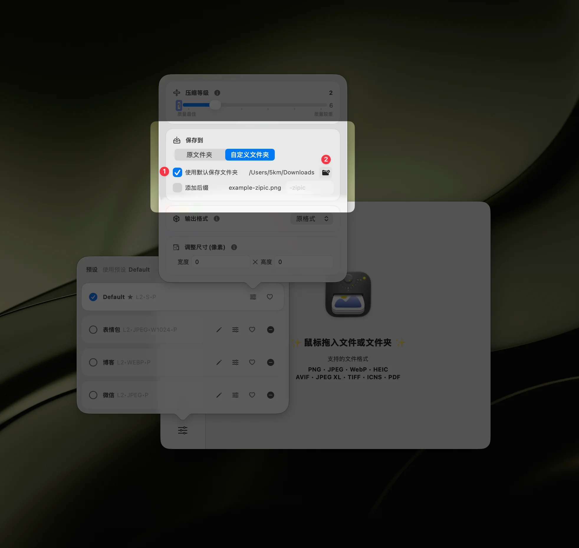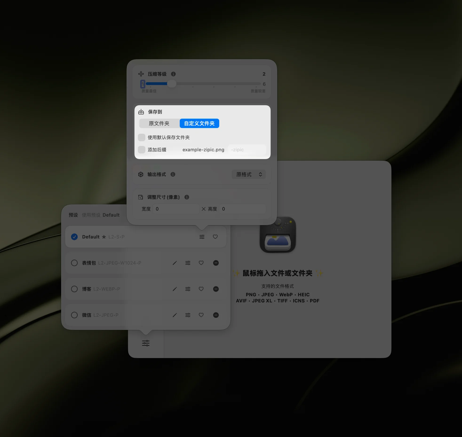 Zipic 提供了多种图像保存选项,你可以根据需要进行选择。主要分为两类:原文件夹、自定义文件夹。