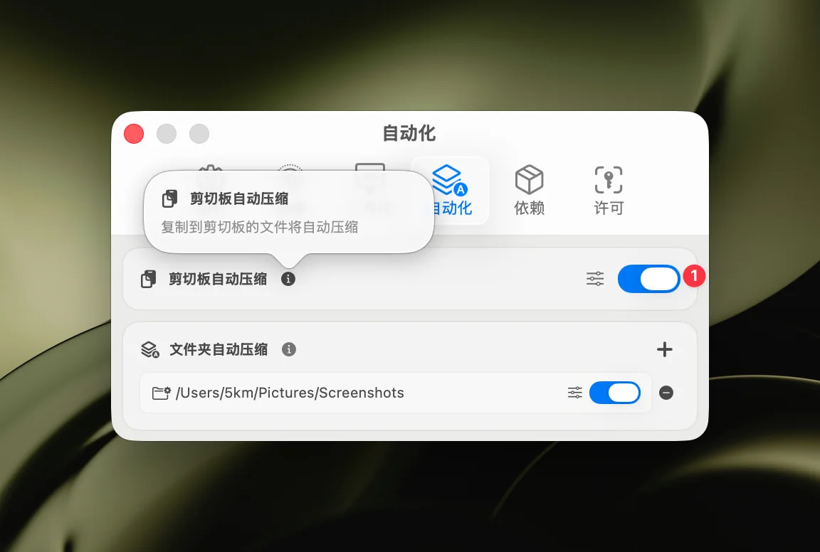 剪贴板自动压缩功能是 Zipic 1.8 引入的自动化功能,可以自动监控剪贴板变化,检测到图像时自动压缩并替换剪贴板内容。