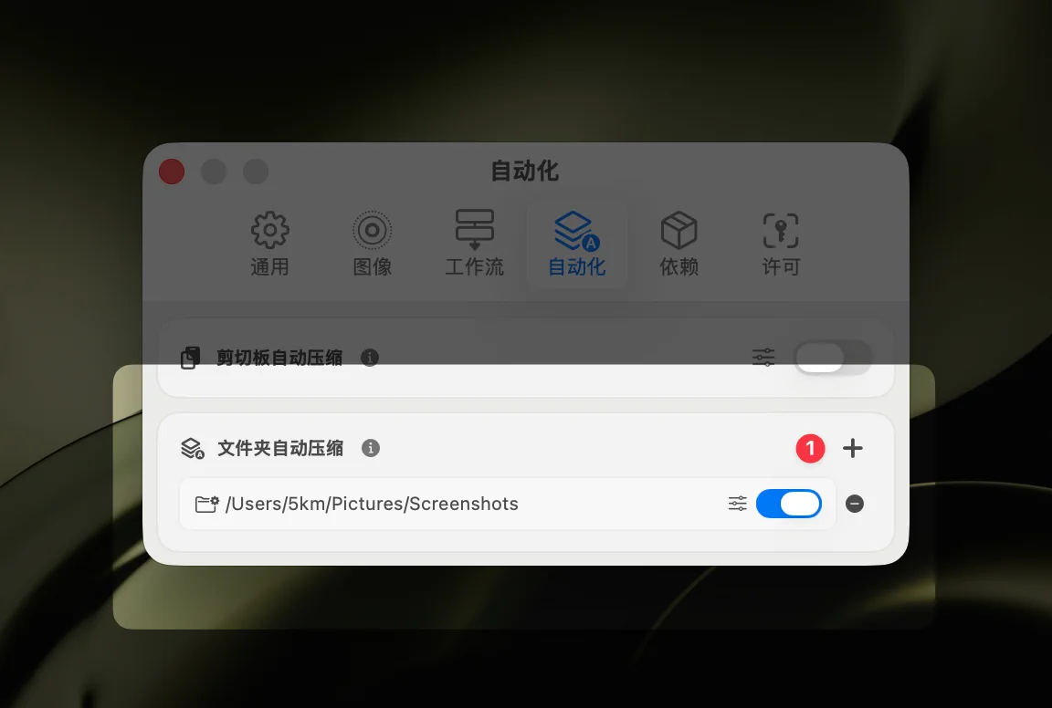 在 设置 → 自动化 中找到 文件夹自动压缩 设置项,点击右侧的 + 号按钮添加监控文件夹。