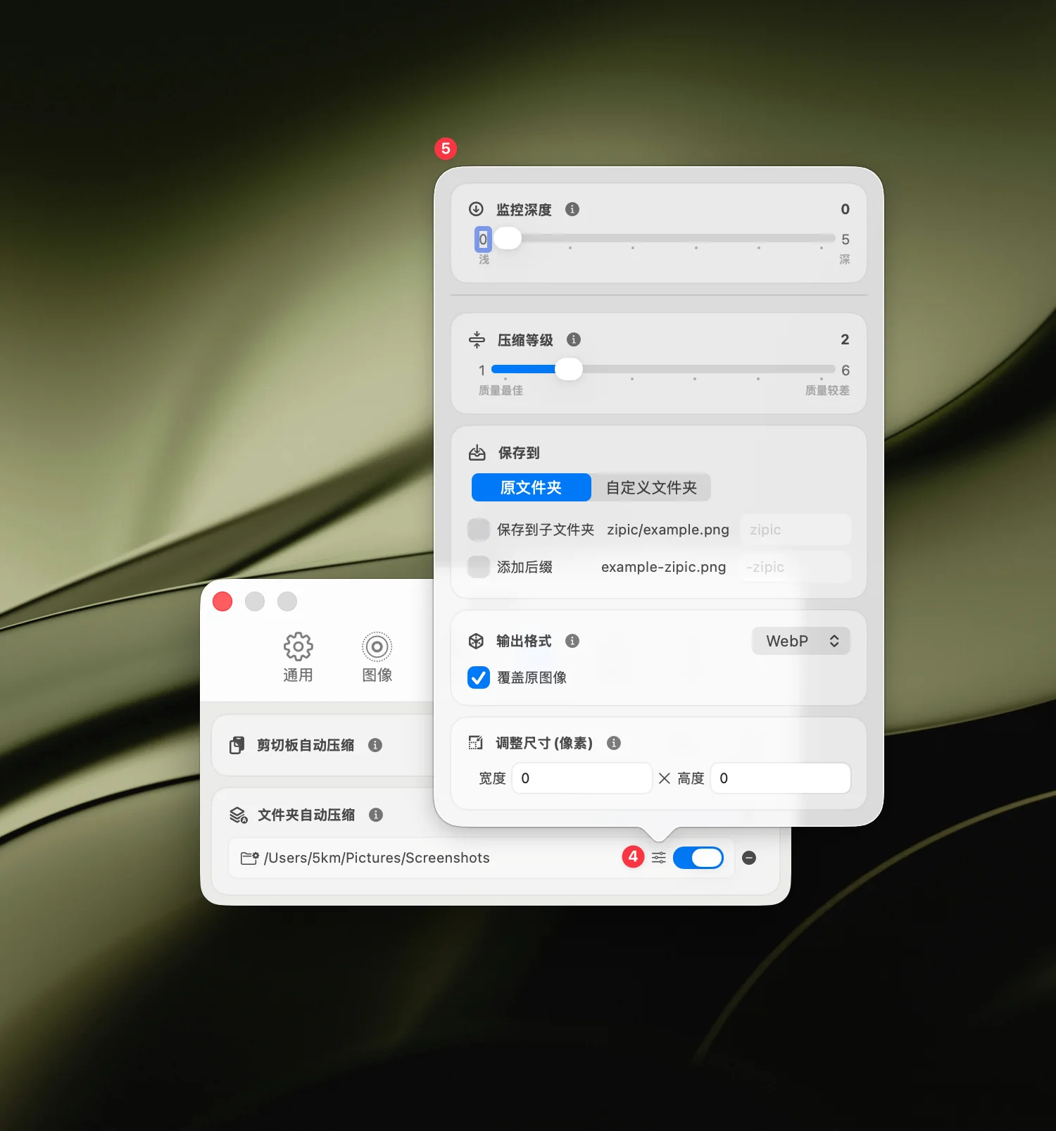 点击 压缩选项 按钮,设置自己需要的压缩选项。在压缩选项窗口中,你可以配置压缩等级、输出格式、保存位置等选项,还可以设置监控深度来控制文件夹监控深入到子文件夹的层级。