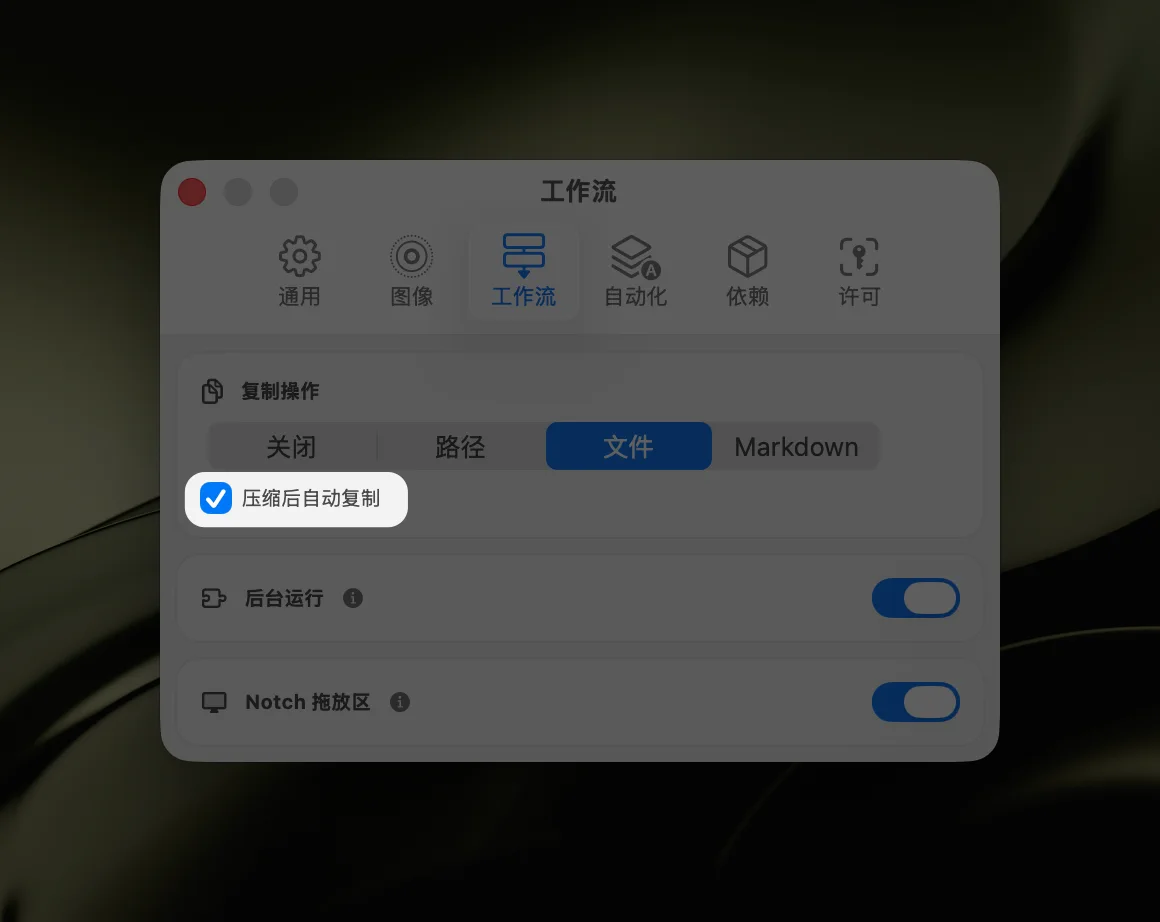 重要:如果希望压缩后的图像自动替换剪贴板内容,需要在 设置 → 工作流 中开启 压缩后自动复制 选项。